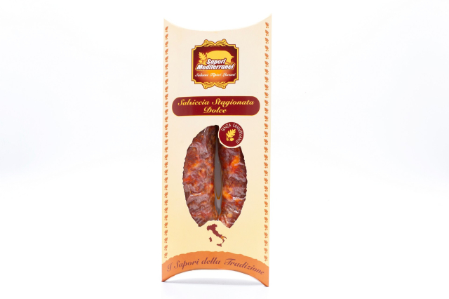The Queen of table is made with selected lean pork meat, coarse-grained cut as requested by the tradition. The meat is flavoured with salt, ground sweet pepper and wild fennel seeds in a quantity wisely measured out. The fragrance is characterised by spicy perfumes; the taste of salsiccia is soft and well balanced.